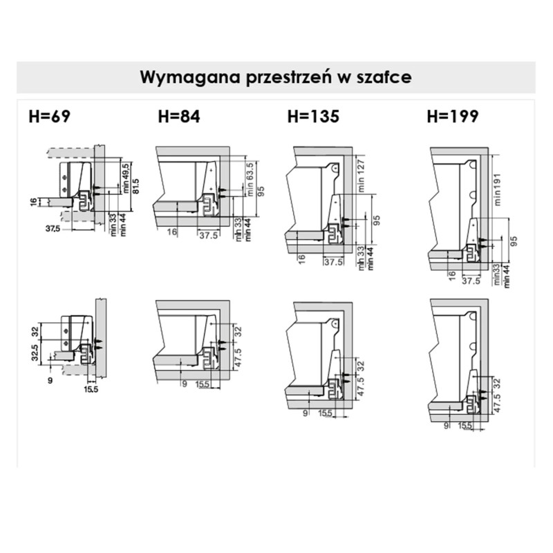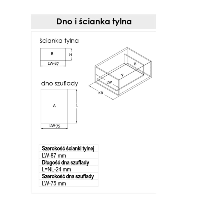 Szuflada ma cienki bok, dzięki czemu maksymalnie wykorzystuje przestrzeń wewnętrzną szafki. Oferowana jest w czterech wysokościach boku: 69 mm, 84 mm, 135 mm i 199 mm, oraz w różnych długościach prowadnic od 250 do 550 mm.