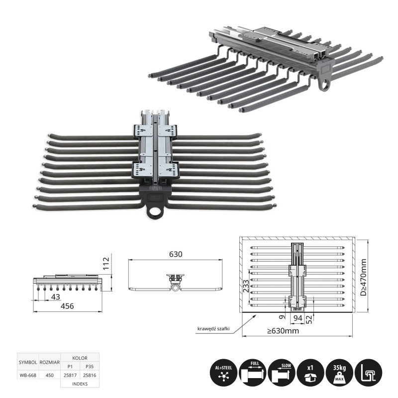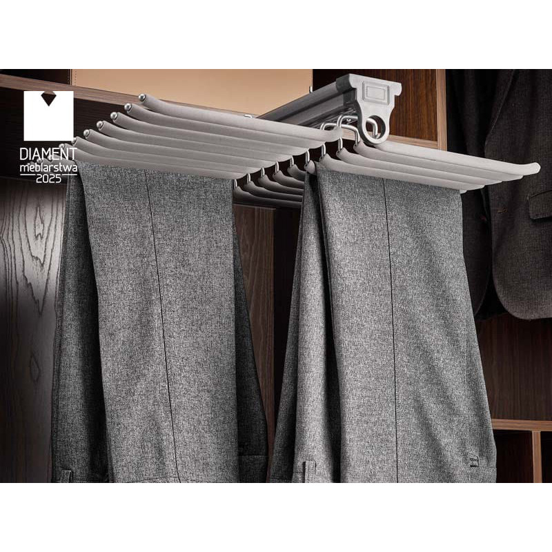 WB-668 to solidny, wysuwny wieszak na spodnie, zaprojektowany z myślą o funkcjonalnej i estetycznej garderobie. To rozwiązanie łączące dużą pojemność, komfort użytkowania i nowoczesny design. Wersja podwójna pozwala na zawieszenie do 20 par spodni, przy zachowaniu porządku i łatwego dostępu do każdej z nich.
