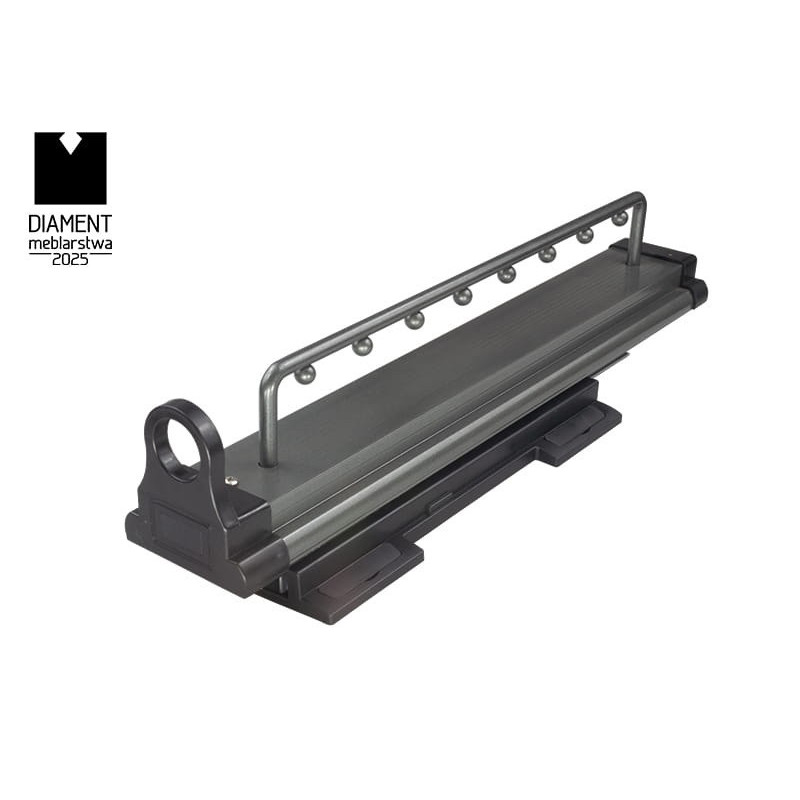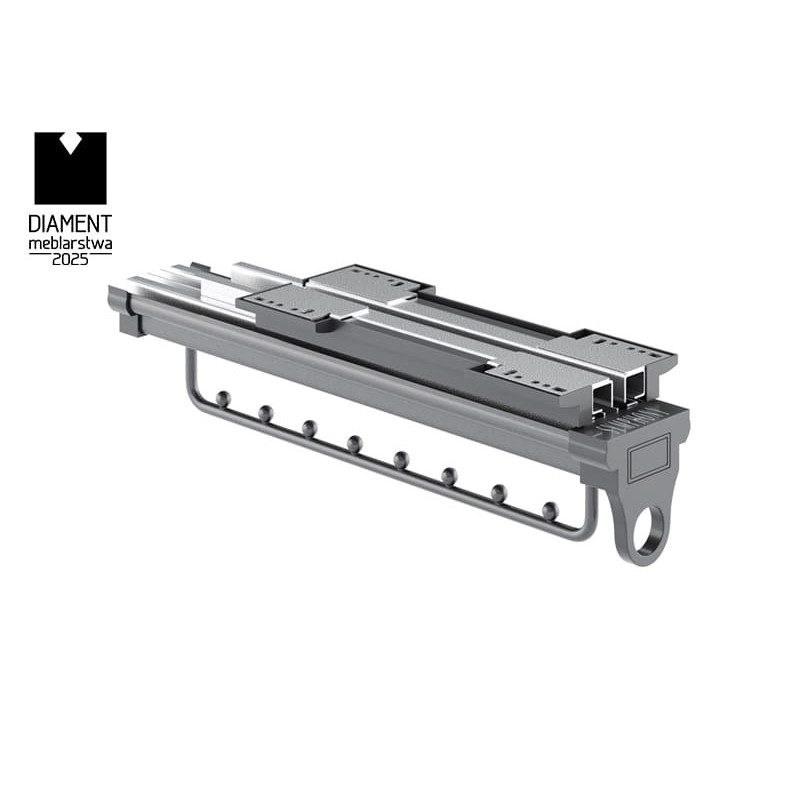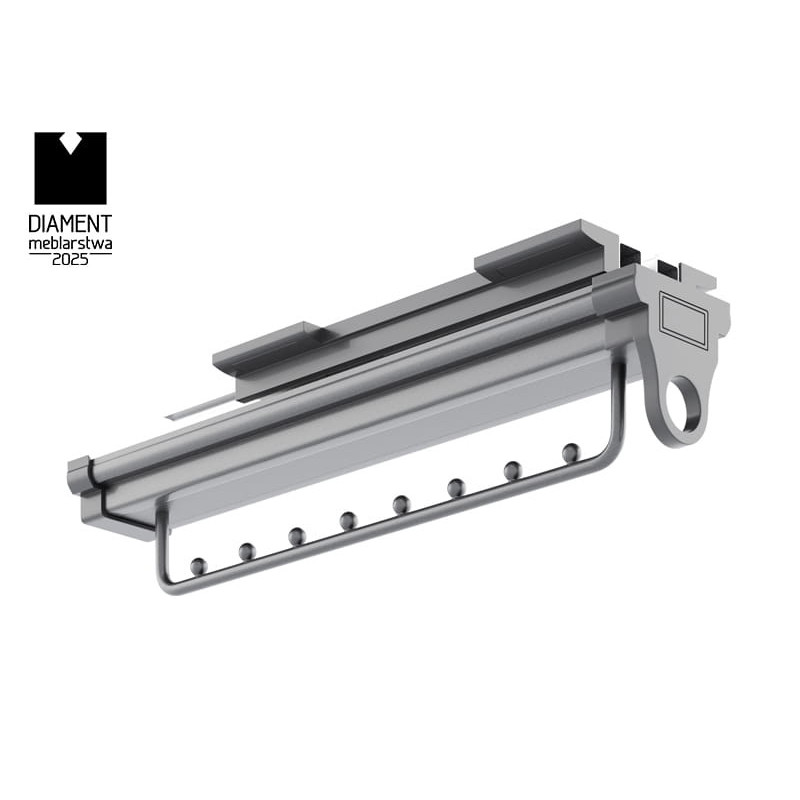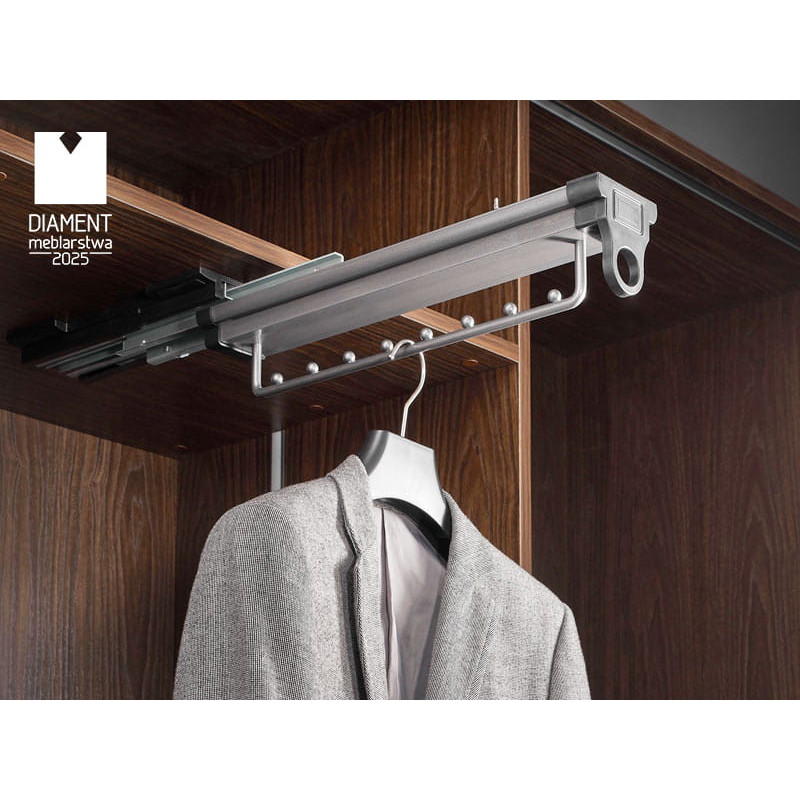 Mechanizm wysuwu z prowadnicą gwarantuje płynne, stabilne rozsunięcie wieszaka, co podnosi komfort użytkowania i ułatwia organizację ubrań.