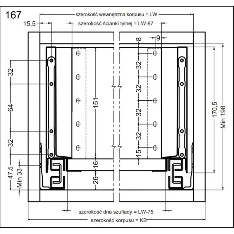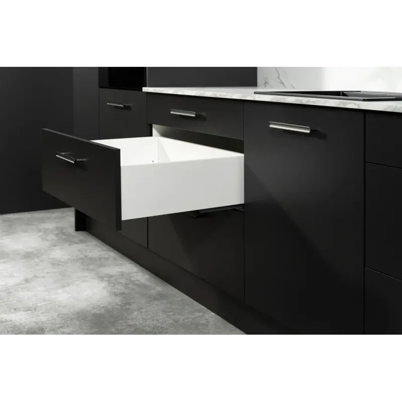 Szuflada Matrix S Slim ma szereg zastosowań w kuchni, garderobie jak i w meblach wolnostojących. Doskonała do frontów wpuszczanych i nakładanych. Cienkie ścianki boczne nie zabierają miejsca do przechowywania. Pełen wysuw i cichy domyk to komfort użytkowania. łatwy montaż, regulacja od wewnętrznej strony. Maksymalne obciążenie szuflady to 35kg. Dostępna w czterech wymiarach wysokości boku: 86,135,167,199mm.