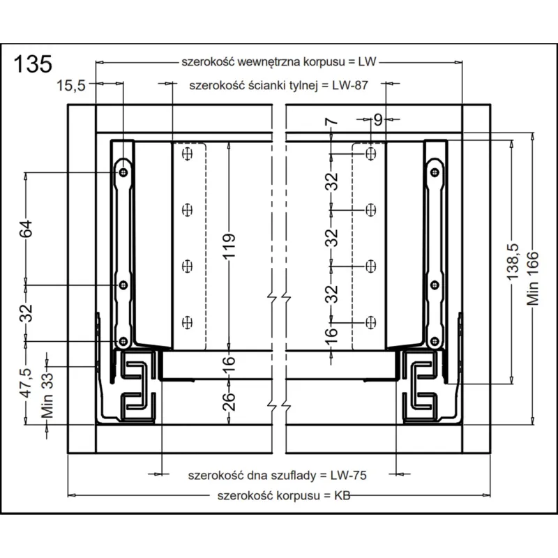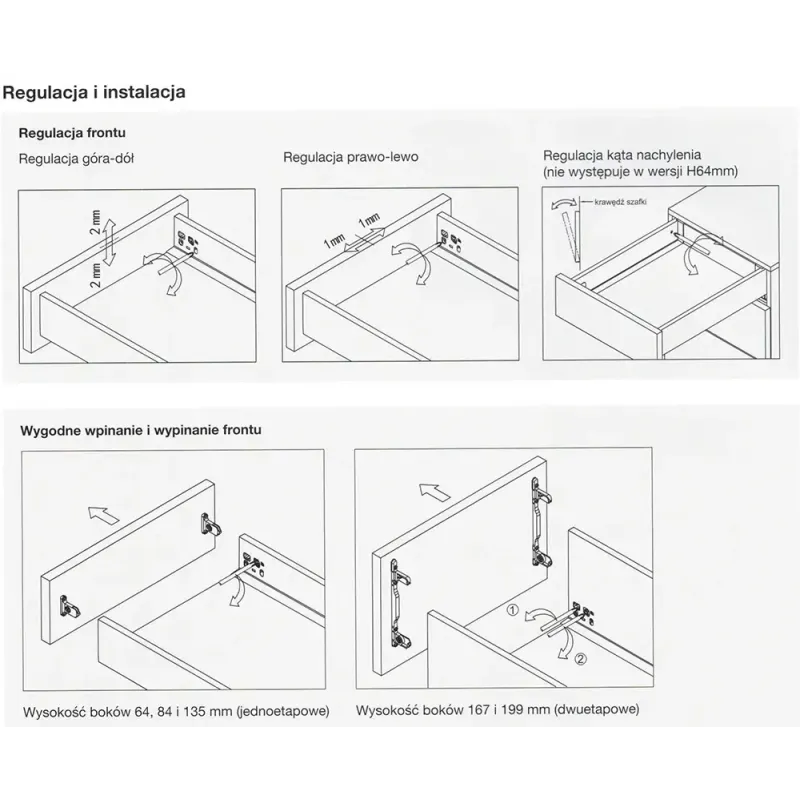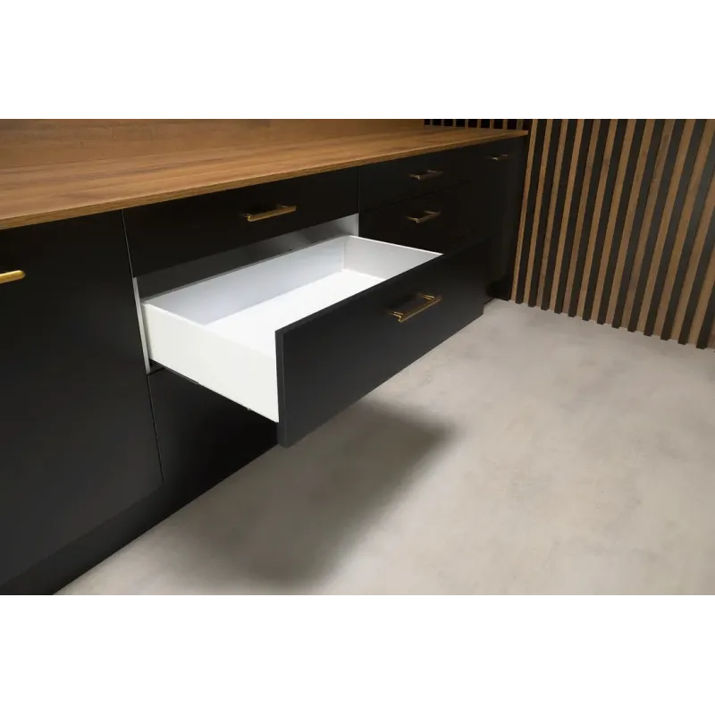 Szuflada Matrix S Slim ma szereg zastosowań w kuchni, garderobie jak i w meblach wolnostojących. Doskonała do frontów wpuszczanych i nakładanych. Cienkie ścianki boczne nie zabierają miejsca do przechowywania. Pełen wysuw i cichy domyk to komfort użytkowania. łatwy montaż, regulacja od wewnętrznej strony. Maksymalne obciążenie szuflady to 35kg. Dostępna w czterech wymiarach wysokości boku: 86,135,167,199mm.