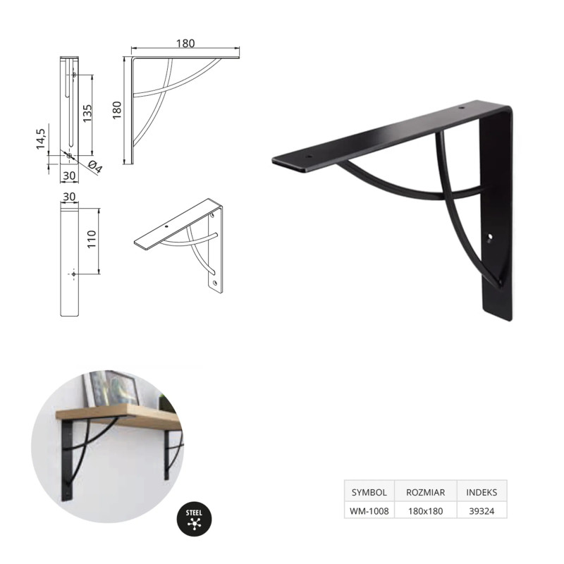 WM-1008 to stylowy wspornik półki w stylistyce loft / industrial, zaprojektowany do estetycznego i solidnego montażu półek ściennych. Wersja 180×180 mm pozwala na wsparcie półek o głębokości do ok. 180 mm, przy jednoczesnym zachowaniu minimalistycznego wyglądu.