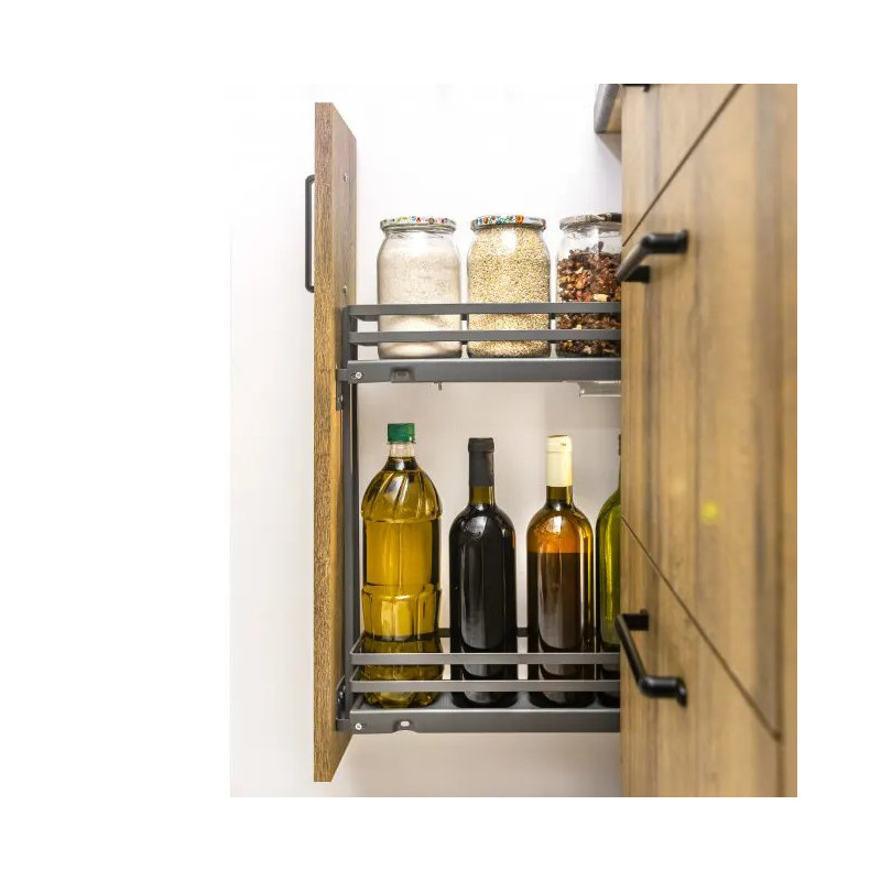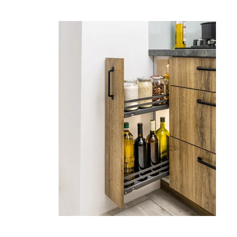 Kosz boczny cargo z serii GTV MOVIXPRO, przeznaczony do montażu w dolnych szafkach kuchennych. Posiada dwie półki z pełnym dnem oraz matę antypoślizgową, która zabezpiecza przed przesuwaniem się przedmiotów. Kosz nie zawiera prowadnic — są one do nabycia oddzielnie, a montaż przy boku korpusu umożliwia ich boczne mocowanie. Kolor konstrukcji: antracyt (RAL 7024), natomiast same półki wykończone są materiałem zabezpieczającym powierzchnię. Kosz przeznaczony jest do szafek o minimalnej szerokości zewnętrznej 150 mm. Maksymalny udźwig wynosi 15 kg. Front można regulować w trzech płaszczyznach, co ułatwia dopasowanie do mebla. System objęty jest certyfikatem na trwałość (60 000 cykli).