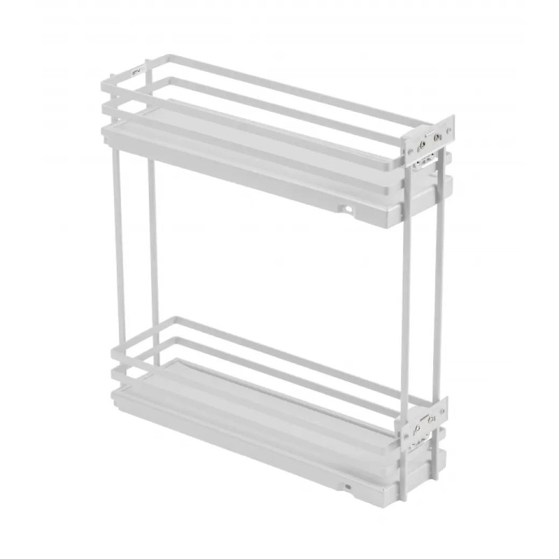 Kosz boczny cargo z serii GTV MOVIXPRO, przeznaczony do montażu w dolnych szafkach kuchennych. Posiada dwie półki z pełnym dnem oraz matę antypoślizgową, która zabezpiecza przed przesuwaniem się przedmiotów. Kosz nie zawiera prowadnic — są one do nabycia oddzielnie, a montaż przy boku korpusu umożliwia ich boczne mocowanie. Kolor konstrukcji: biały (RAL 9016), natomiast same półki wykończone są materiałem zabezpieczającym powierzchnię. Kosz przeznaczony jest do szafek o minimalnej szerokości zewnętrznej 200 mm. Maksymalny udźwig wynosi 15 kg. Front można regulować w trzech płaszczyznach, co ułatwia dopasowanie do mebla. System objęty jest certyfikatem na trwałość (60 000 cykli).