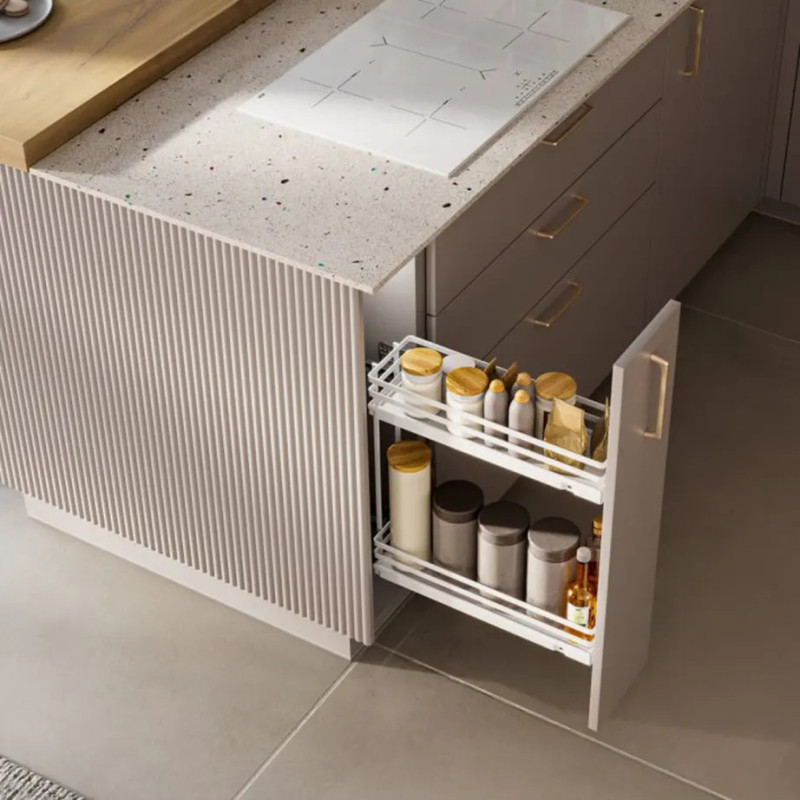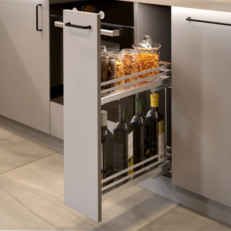 Kosz boczny cargo z serii GTV MOVIXPRO, przeznaczony do montażu w dolnych szafkach kuchennych. Posiada dwie półki z pełnym dnem oraz matę antypoślizgową, która zabezpiecza przed przesuwaniem się przedmiotów. Kosz nie zawiera prowadnic — są one do nabycia oddzielnie, a montaż przy boku korpusu umożliwia ich boczne mocowanie. Kolor konstrukcji: biały (RAL 9016), natomiast same półki wykończone są materiałem zabezpieczającym powierzchnię. Kosz przeznaczony jest do szafek o minimalnej szerokości zewnętrznej 150 mm. Maksymalny udźwig wynosi 15 kg. Front można regulować w trzech płaszczyznach, co ułatwia dopasowanie do mebla. System objęty jest certyfikatem na trwałość (60 000 cykli).