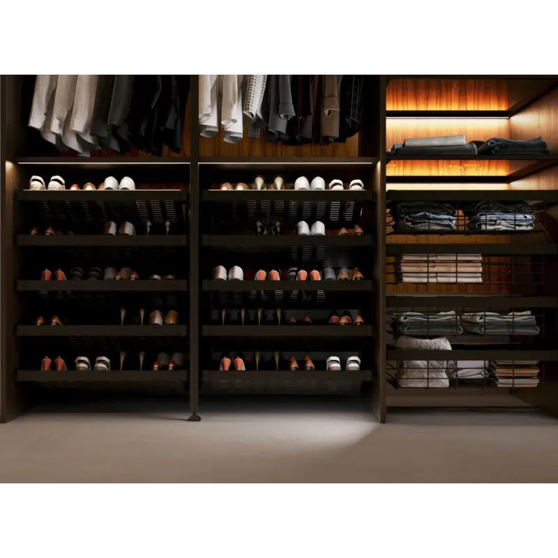 Szuflada z serii GTV ELITE to funkcjonalne rozwiązanie do garderoby lub szafy, przeznaczone do przechowywania obuwia — buty są w niej uporządkowane, dobrze widoczne i łatwo dostępne. System został zaprojektowany tak, aby maksymalnie ułatwić użytkowanie i montaż, dzięki regulowanej ramie i prowadnicom z cichym domykiem.