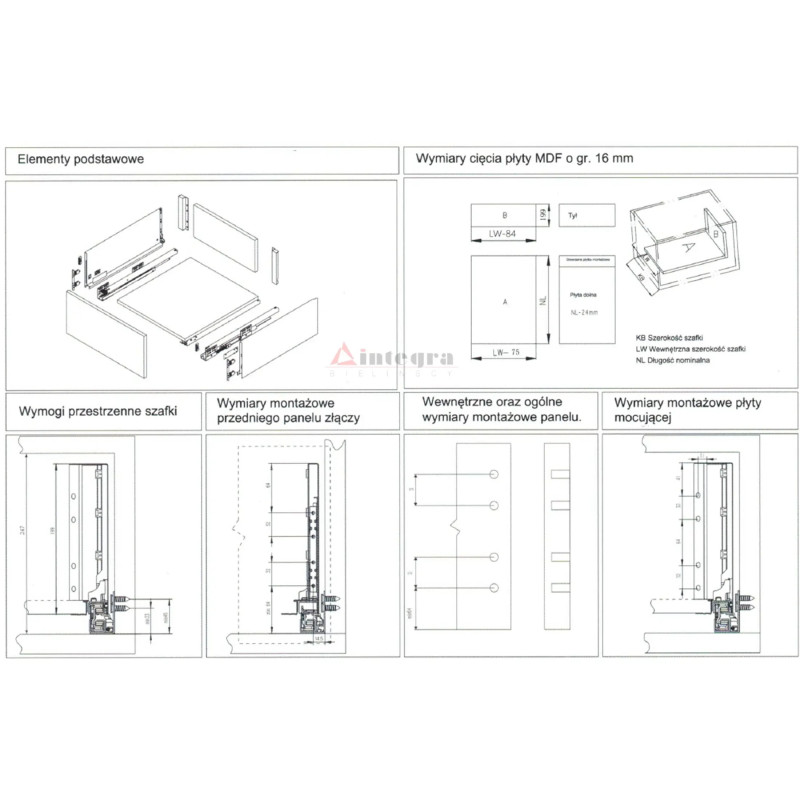 W skład kompletu nie wchodzą elementy płytowe, czyli dno i ścianka tylna szuflady (należy je wykonać we własnym zakresie). Zalecana grubość elementów płytowych to 16 mm.