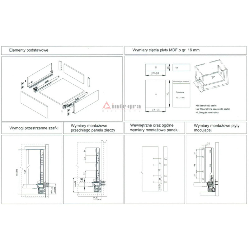 W skład kompletu nie wchodzą elementy płytowe, czyli dno i ścianka tylna szuflady (należy je wykonać we własnym zakresie). Zalecana grubość elementów płytowych to 16 mm.