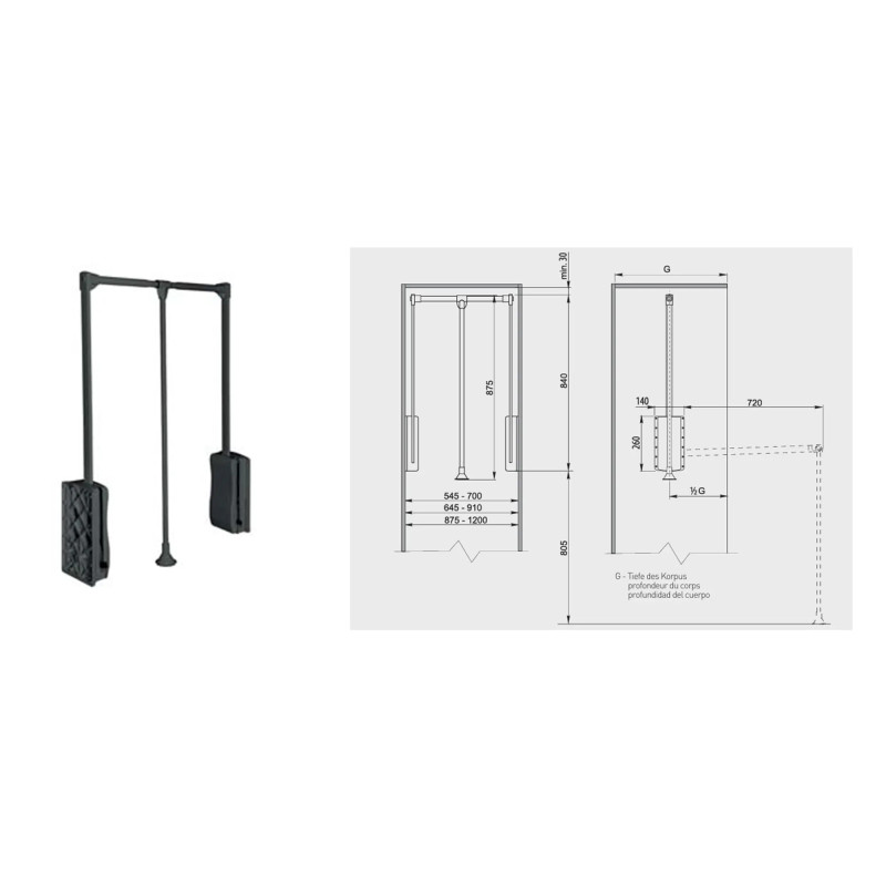 Pantograf GTV PG-ST4560-60 w kolorze antracyt to wysokiej jakości, funkcjonalny wieszak opuszczany do szaf i garderób, który znacząco podnosi komfort użytkowania wysokich szaf wiszących. Dzięki solidnej konstrukcji oraz płynnemu mechanizmowi opuszczania umożliwia wygodne zawieszanie i zdejmowanie odzieży bez konieczności schylania się lub używania drabiny.