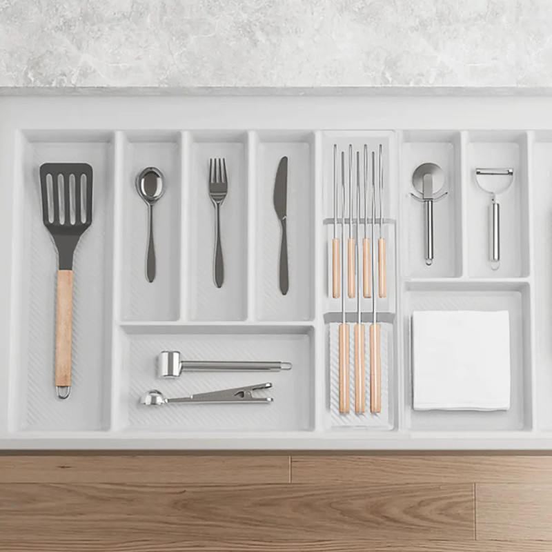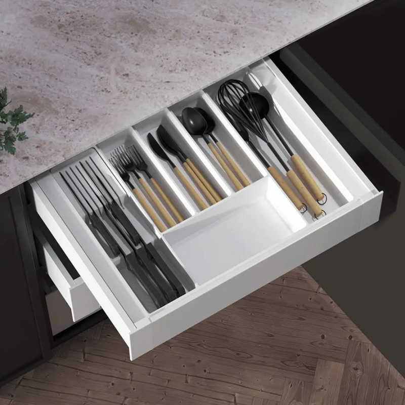 Produkt wyposażony jest w 7 przegród, które pozwalają na przechowywanie 3 długich oraz 4 krótszych noży, dzięki czemu wszystkie najczęściej używane narzędzia kuchenne są zawsze pod ręką. Organizer jest kompatybilny z wkładami na sztućce MAX firmy REJS o szerokości szuflad od 450 do 900 mm, co pozwala stworzyć spójny i estetyczny system organizacji wnętrza szuflady.